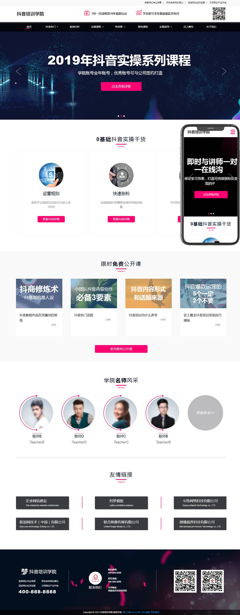 抖音培训学院学校通用响应式织梦模板,适用于DedecmsV5.7系统,DEDECMS内核UTF编码。