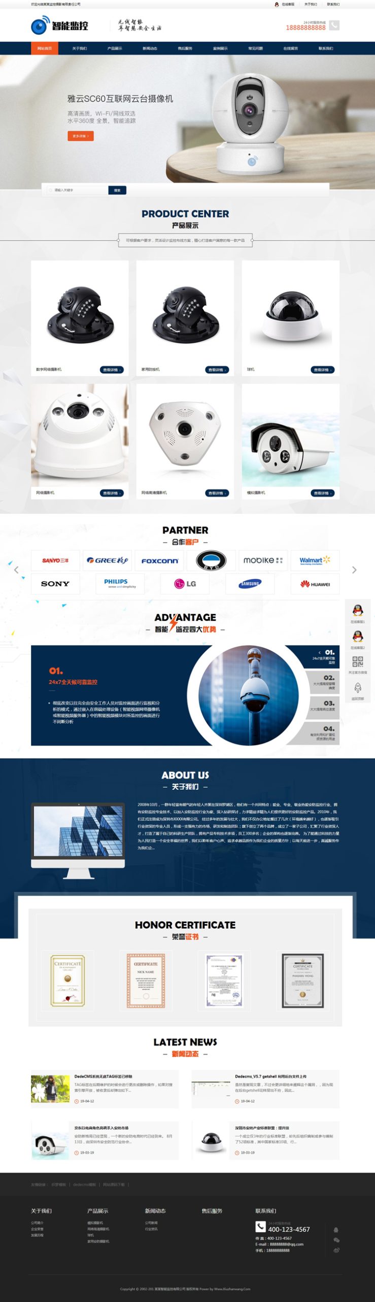 本套织梦自适应模板采用流行的自适应结构写法,移动端更易获取排名,安防设备自适应模板也可用于一般企业站,更多模板可以登录商业织梦模板栏目查看。