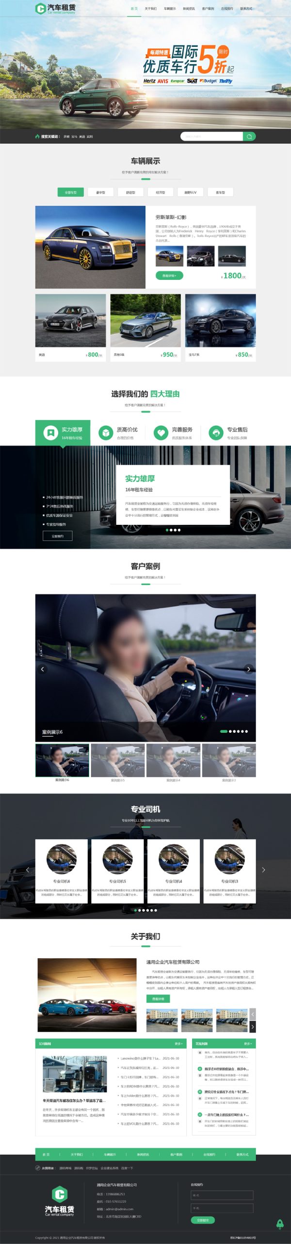 绿色配色,高端大气,适用于HTML5响应式、企业通用、车行、汽车租赁、二手车销售类企业使用,兼容各项终端设备。汽车租赁网站模板/汽车租赁网站源码下载