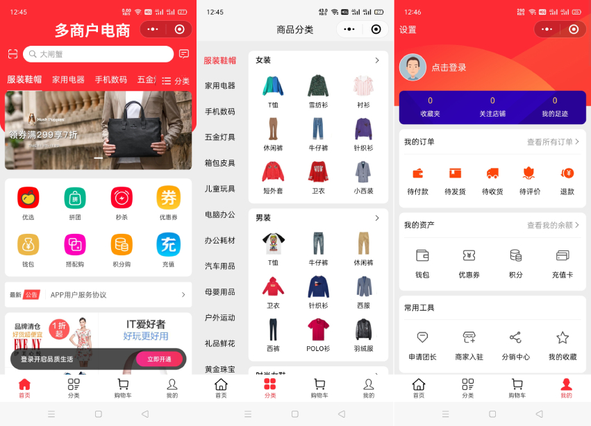 开源多商城系统源码,功能比较多,有PC端,H5端,微信小程序;请按照系统源码安装文档要求部署。软件有2版本选择,1个是标准版;1个是多商户版。